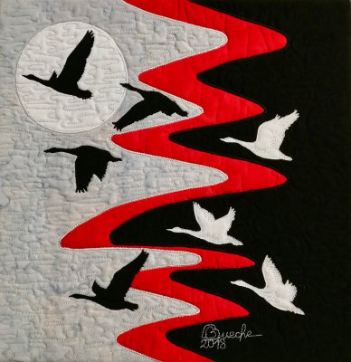 En attendant, voici un florilège de quilts picturaux, parfois à la limite de l’abstrait, d’une femme que j’admire beaucoup, Béatrice Bueche. Je verrais si bien ses œuvres pour calmer, soigner, redonner goût à la vie dans des maisons de soins ! Curieusement mes choix se portent sur des tableaux textiles où le noir est parfois très présent. Pourtant, ils vibrent et me rendent joyeuse !