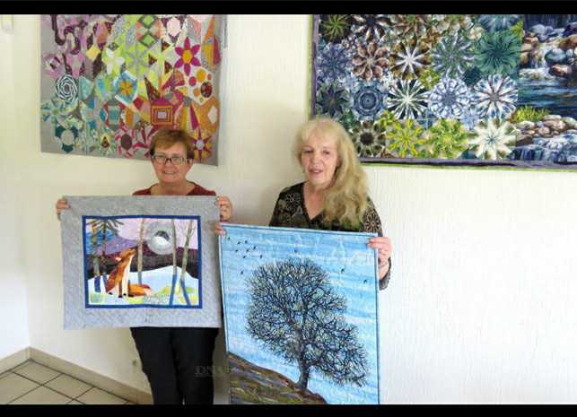 EDIT : je l’ignorais, mes deux amies cachottières, Béatrice Bueche et Michelle Braun, exposent des œuvres en ce moment-même au Palais Gourmand, un très bon restaurant au nord de l’Alsace ! Voici les deux artistes, le jour du vernissage :