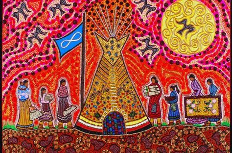 La peintre Leah Dorion est Métisse, mais pas exactement dans le sens où vous le comprenez. Les Métis sont un peuple du Canada, ayant une part d’origine autochtone et une autre part française ou écossaise. Oui, des hommes français et écossais, marchands de fourrure, se sont assimilés en se mariant avec des femmes locales dans les années 1700 et leurs descendants forment une culture originale. Ils sont reconnus comme un des 3 peuples autochtones du Canada (les Amérindiens, les Inuits, les Métis).