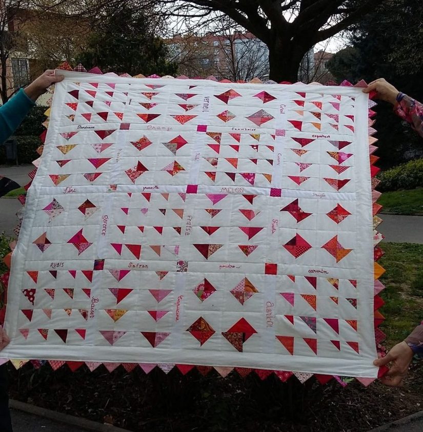 Ces quilts ont été exposés à Lacaze le 27 juin dernier et ont contribué à l’originalité de notre expo en soulignant notre sentiment de sororité. Est-ce facile de faire ces lettres piécées ? Oui… mais non. A vrai dire, certaines y arrivent facilement et font des lettres en deux temps trois mouvements. Si on n’y arrive pas tout de suite, c’est pas grave, ya pire dans la vie. Pour moi qui fais souvent parler mes quilts, c’est devenu très simple, et vous aussi deviendrez experte et vous direz ensuite c’est bon, je gère, laissez faire la pro ! Je suis impatiente de proposer cet exercice en stage, vous verrez, on va faire simple, vous aurez ensuite un sourire d’enfant en jubilant viva la vida !