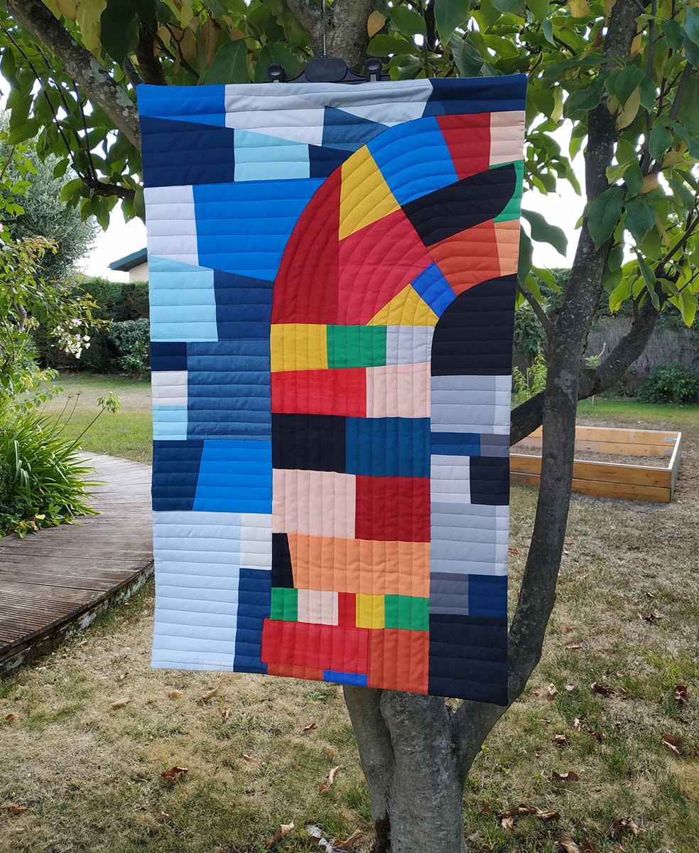 J’ai quilté à la machine en suivant la courbe de l’arc , puis disposé des lignes droites de part et d’autre.