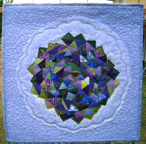 Une fleur à cinq pétales, la violette, emblème de Toulouse ! C’est un quilt à nul autre pareil, fruit des techniques d’improvisation de Sherri Lynn Wood, thérapeute et quilteuse, dont les conseils illuminent ce livre déjà évoqué dans la Ruche :