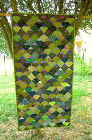 Ce quilt au fond noir, néanmoins très gai, fut fait à la vitesse de l’éclair, assemblé et quilté en quelques demi-journées : c’est le privilège des tops coupés et cousus au coup d’oeil et à main levée. Ainsi sont faits toute une branche de quilts contemporains. Celui-ci est toujours issu d’un modèle du livre de Sujata Shah (livre : Cultural Fusion Quilts, C&T éditions). Un éditeur aura-t-il l’idée de le faire traduire pour toutes celles qui préfèrent les textes en français ?…