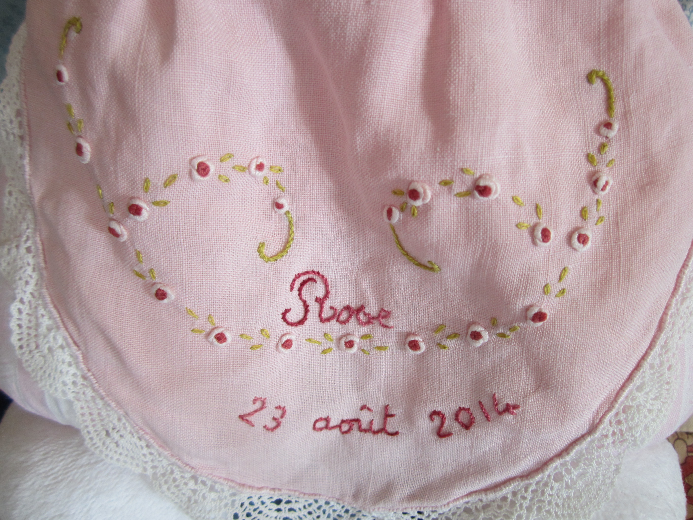 Admirez le point de tige, brodé deux fois de deux couleurs différentes pour figurer la légère ombre du renfoncement du biscuit. Les petites dents ont été, de même, brodées à la main. Vingt heures de travail pour réaliser son rêve !