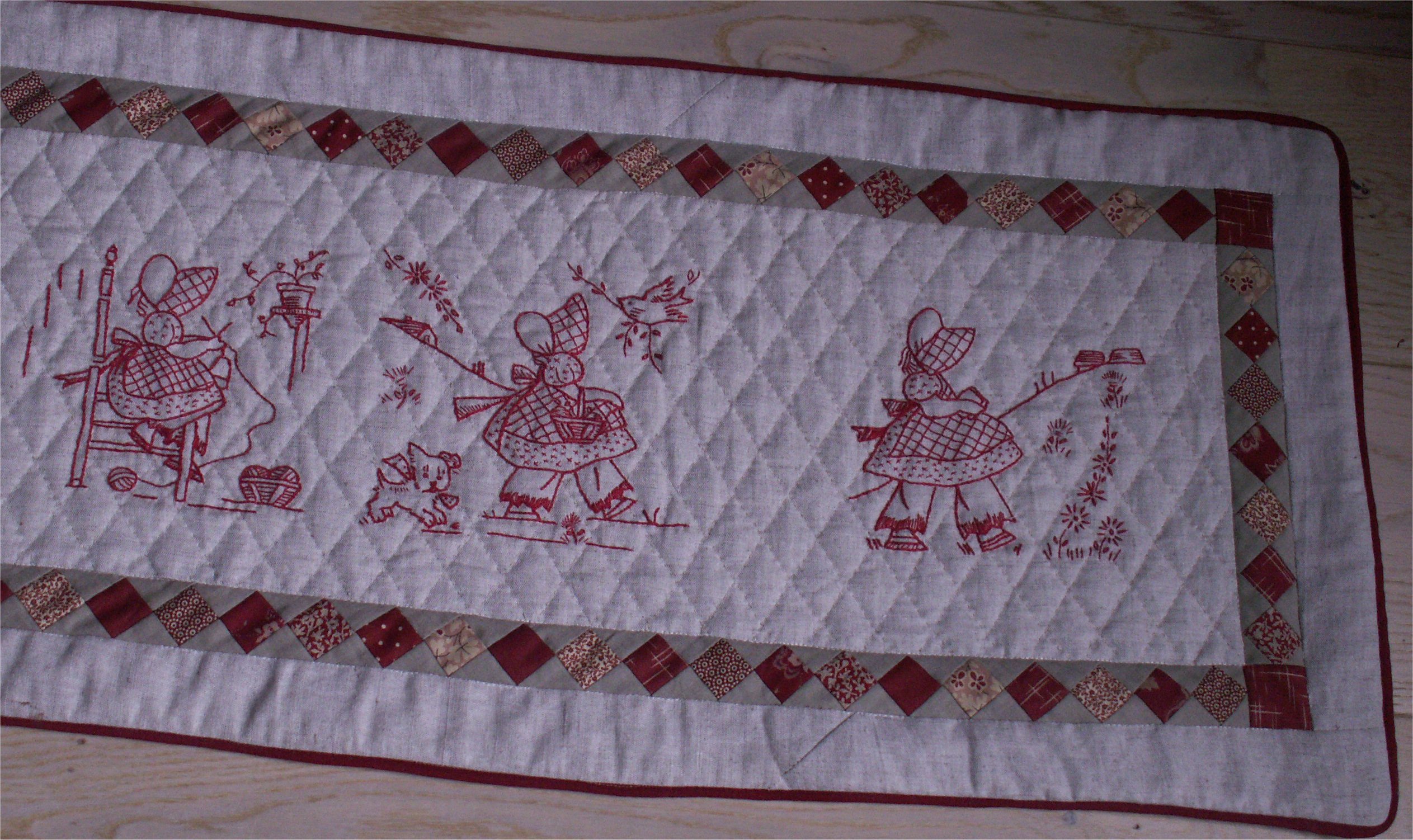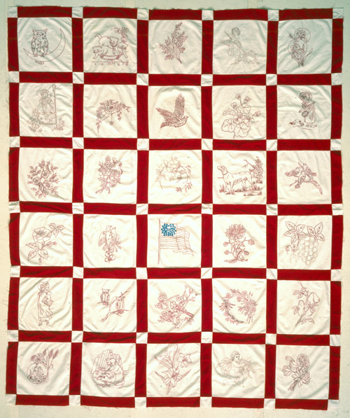 L’exposition d’un top en Redwork de 1881 de Pennsylvanie, au Mona Bismarck American Center en 2013 lors de l’exposition « Quilt Art – l’Art du Patchwork » nous donna l’opportunité d’en saisir le sens. Ces quilts aux blocs de redwork connurent un véritable engouement vers 1900.