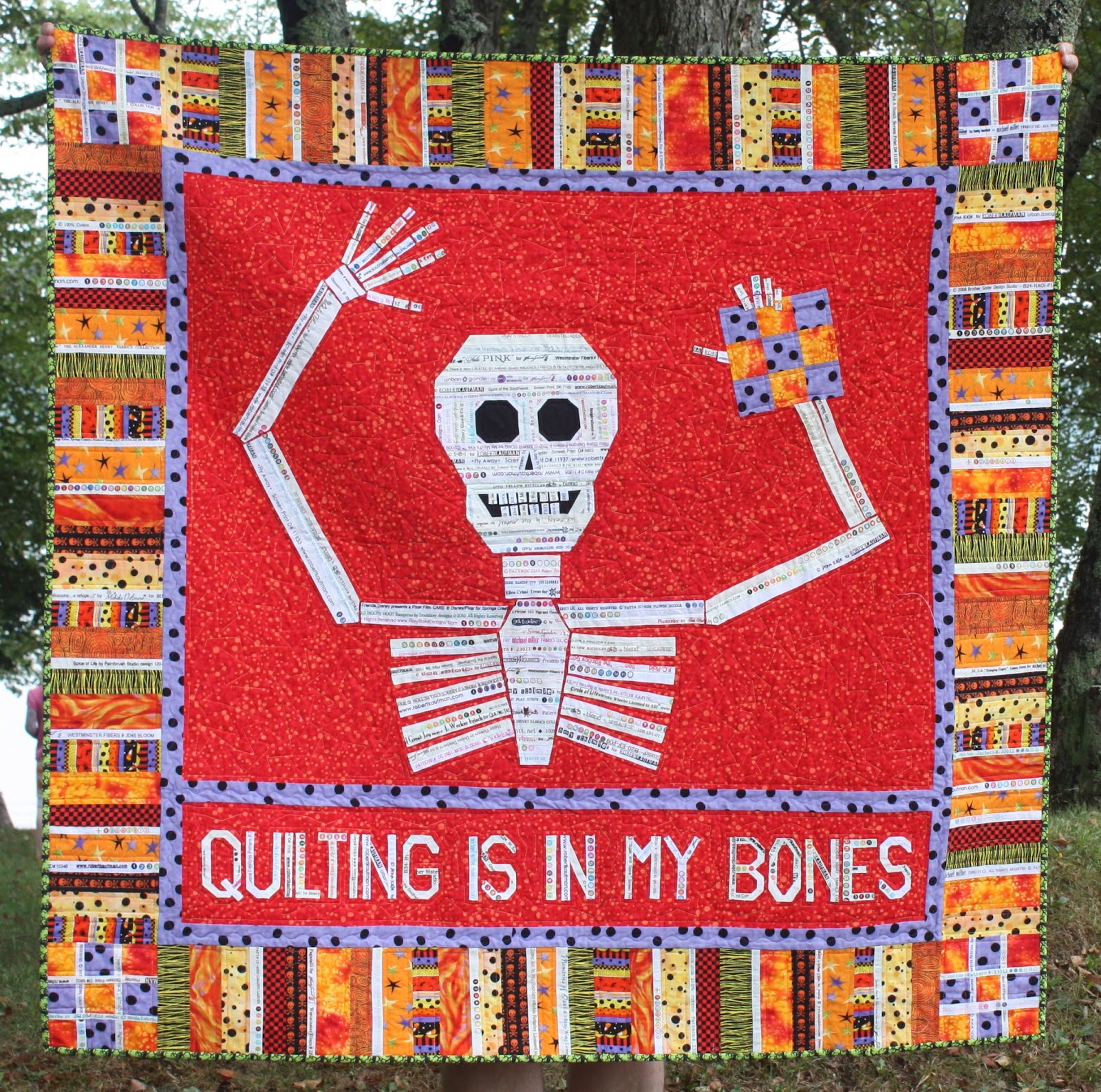 Halloween miniquilt, Pinkadot QuiltsSquelette en lisières, Riel NasonLes citrouilles de Bonnie Hunter, modèle dans son livre String Frenzy.Etoile à 5 branches de Victoria Findlay Wolfe, aux couleurs de Halloween, même si ce n’est pas le sujet du quilt !