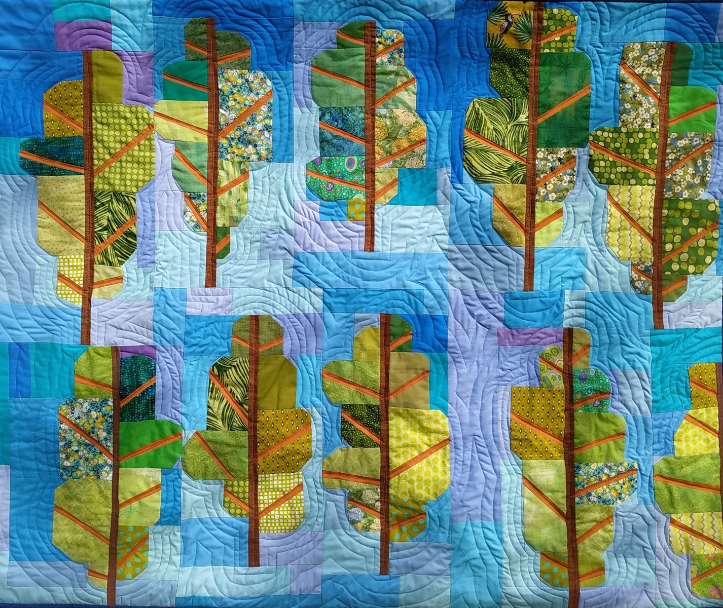 J’ai fait avec ma sensibilité du moment présent, avec toutes sortes de verts imprimés, toutes sortes de bleus unis, des branches orange (plus exactement Cedar, de Kona Cotton), un tronc brun… Il est judicieux de lire les explications. Je peux cependant vous montrer comment j’ai créé mes arbres, alors que dans la nature les arbres verdissent eux aussi en parfaire harmonie avec mon travail en atelier !