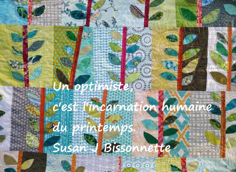 En plein printemps, malgré le confinement, gardons le moral ! La citation de la poétesse canadienne est sur un autre quilt printanier, Jeunes Pousses, qui a de nombreux tissus en commun avec La Forêt Enchantée.