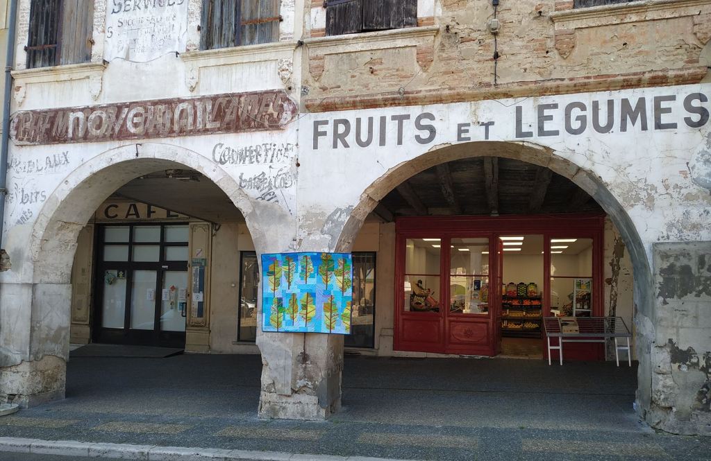 Lors d’une journée ensoleillée, le 23 mars, mon mari et moi avons découvert un petit paradis non loin de chez nous, la Lomagne (sud-ouest du Tarn-et-Garonne). Des collines comme dans le Gers tout proche, des villages qui fleurent bon le Sud-Ouest, une petite ville active, Beaumont-de-Lomagne, où est né le mathématicien Pierre de Fermat… A noter que les devantures de magasins, souvent en bois, sont très précieusement préservées, ainsi que les écritures peintes… L’accueil des commerçants et des passants était très sympathique et le quilt attirait les badauds.