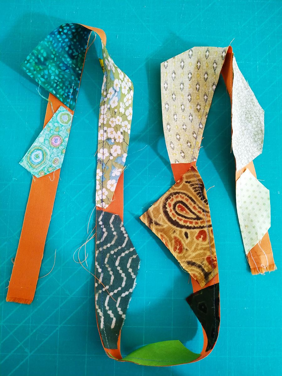 Les branches sont faites d’une bande coupée à 2,5 cm de haut (ici Kona Cedar, acheté Au fil d’Emma), je couds en série les moitiés basses des frondaisons, puis je sépare chaque rectangle vert en coupant la bande orange, en suivant l’inclinaison, et enfin je couds les moitiés supérieures. Après quelques hésitations et quelques erreurs, tout se passe vite et bien.