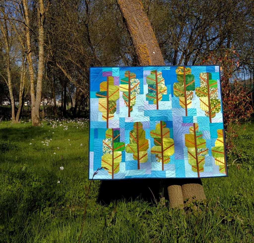 Voici de plus près La Forêt Enchantée, 100 x 120 cm environ, quilt fait en mars 2021 pour les 50 ans de Véronique.