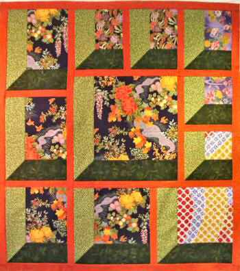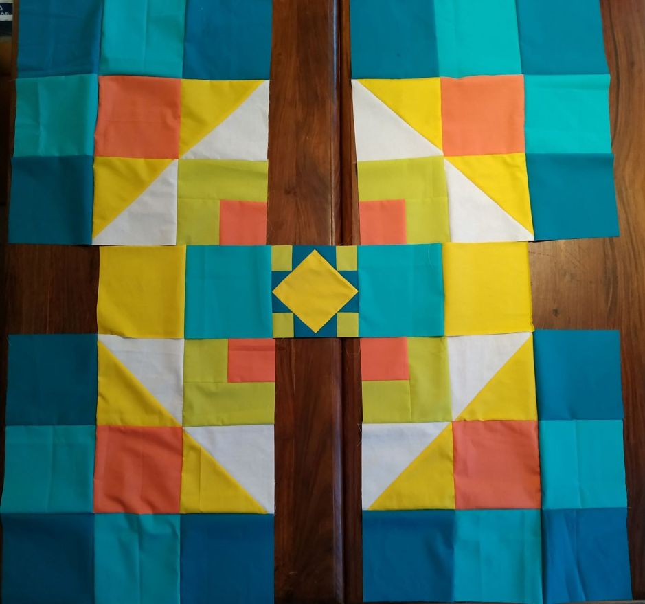 La logique veut qu’on assemble 4 fois bloc diamant + les deux carrés unis, selon votre charte de couleurs. On assemble d’abord les deux quarts du haut, avec le bloc diamant en haut, puis les deux quarts du bas avec le bloc diamant en bas, et enfin la bande horizontale centrale, avec le bloc du milieu. Mais l’important est d’arriver à faire le top, selon votre logique !