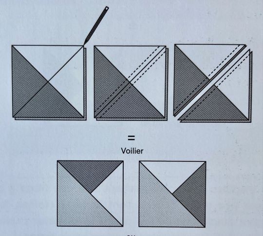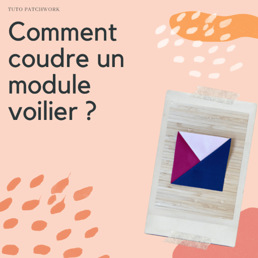 Alexandra et Alice préconisent de préparer d’abord des modules « voilier » pour faire le bloc « diamant », puis 2 carrés bicolores, faits précédemment en suivant le déroulé du PDF (en alternative, on peut faire un module « Vol d’oie »). Voici le visuel d’Alice pour expliquer ce processus du bloc voilier, qui contient plus de coutures que ma façon de faire, mais elle est simple (mesures en inch dans le PDF) :