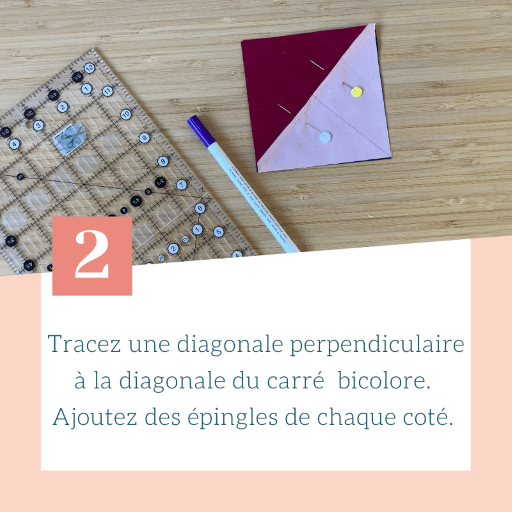 Le diamant sera reconstitué avec la couture suivante (juste au-dessus, c’est la couleur la plus claire). Ce module sera complété par 2 carrés bicolores, comme expliqué sur le PDF, ou bien un vol d’oie de 20 cm de base. Comme il en faut 4 (un pour chaque bloc), on peut utiliser cette méthode « vol d’oie 4 par 4 ». J’avais fait une fiche sur cette technique il y a 17 ans, pour mon club d’alors ! Explications anciennes donc, mais toujours bien pratiques :