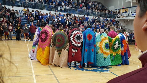 A l’issue de fêtes locales chez les Natifs (Amérindiens), ou comme ici de compétitions de basket ball au lycée de Poplar, il n’est pas rare que plusieurs quilts soient offerts aux entraîneurs, aux meilleurs sportifs, aux profs… Jamais, un quilt n’est refait à l’identique !