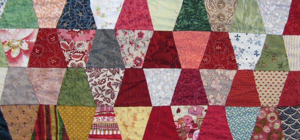 Comme je reste très classique dans mon expression, je me cantonne aux formes traditionnelles du patchwork, il y a déjà tant à faire ! Une fois la géométrie choisie -ici le modèle des dés- je m’amuse ! J’aime beaucoup la simplicité des scrap-quilts avec un seul gabarit. Pour celui-ci, j’ai respecté en général la règle du clair et du foncé en alternance, mais parfois j’ai volontairement cassé l’harmonie. Je ne dirai pas comme d’anciennes quilteuses construisant un bloc avec une erreur appelé « bloc d’humilité », que c’est « parce que seul Dieu est parfait », chez moi c’est juste parce que cela me plaît !