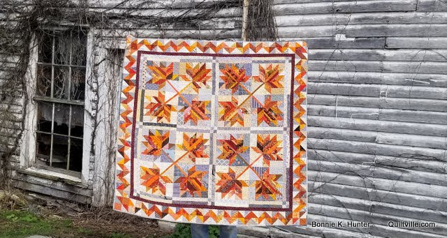 L’image de ce début d’automne, Bonnie Hunter et son dernier quilt ! C’est un quilt carré d’environ 144 cm de côté, dans lequel vous pouvez caser toutes vos chutes de tissus du jaune au brun, en passant par tous les orange et rouille, et vos beige et gris en tissus de fond.