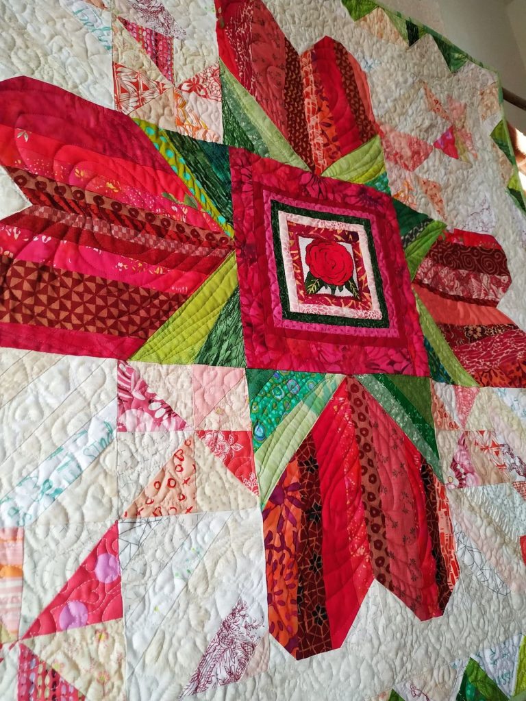 Derrière la maison, Mon amie la Rose, Katell, 2021Jeudi 11 février, comme un air de printemps dans le Sud, alors que mes sœurs regardent la neige tomber en Bretagne et à Paris…Un vrai scrap-quilt, dans la tradition des string-quilts. Traduction : il est composé de beaucoup de tissus différents, dans la tradition des quilts faits avec des bandes de récupération. Le quilting sur la partie claire dessine des centaines de ❤.Jeux d’ombre et de lumière.