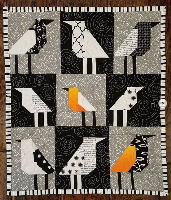 Pour ma part, j’ai découvert ces oiseaux grâce à Jill de Pie Lady Quilts, qui proposa en 2015son propre tuto d’oiseau improvisé sur son blog (avec une jolie petite tête !). Elle a fait deux splendides quilts aux oiseaux :