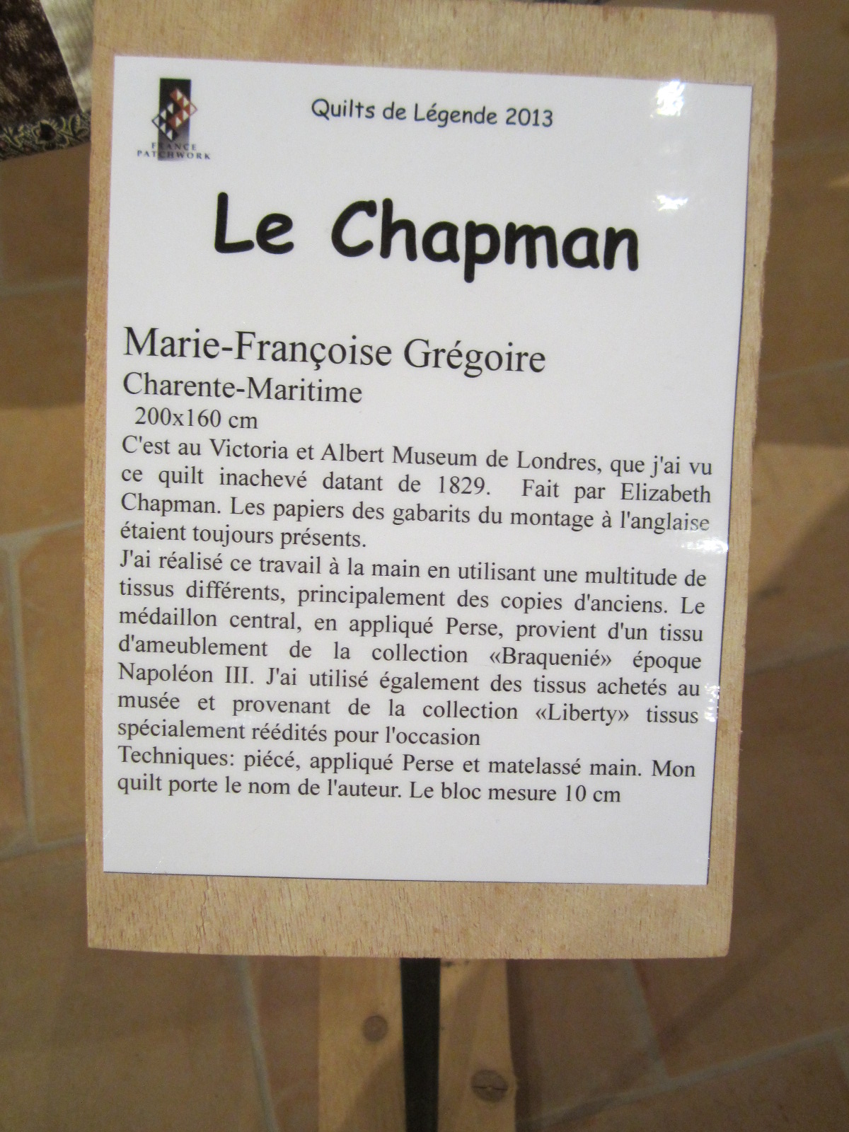 Ainsi s’achève cette visite virtuelle. Volontairement, je ne vous ai pas fait un catalogue exhaustif afin de garder la joie de la découverte pour les futurs visiteurs ! J’ai voulu vous montrer surtout les quilts pour lesquels je pouvais, à ma mesure, ajouter un « petit plus » pour les futurs visiteurs. Et, bonne nouvelle, un catalogue est édité par France-Patchwork : un photographe professionnel a pris chaque quilt élu sous son meilleur angle et nous pouvons emporter maintenant avec nous un beau souvenir de cette exposition.