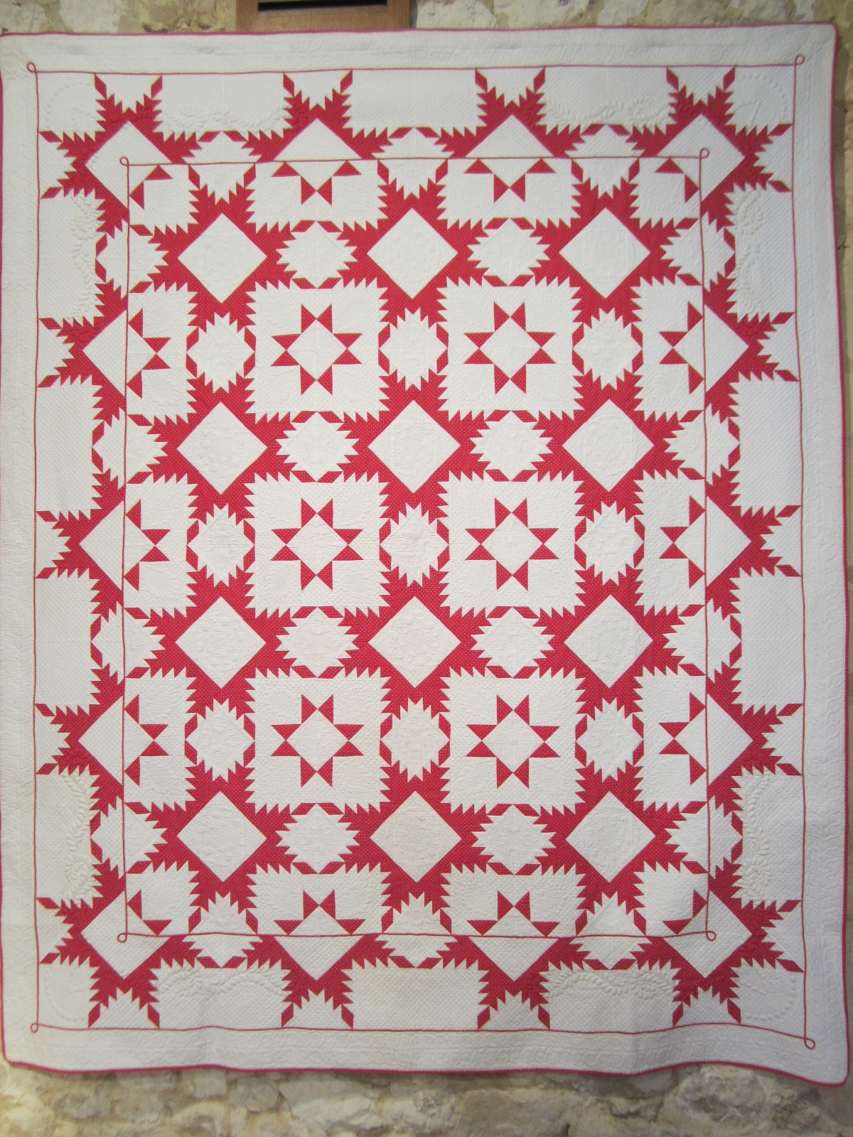 Ce Lone Star Quilt date de 1880 environ, signé par une Anglaise d’origine, Ellen Fullard (1818-1889), émigrée en 1842, mariée à James Hunter Wright (1813-1880), anglais d’origine lui aussi… L’histoire des quilts anciens nous replonge inlassablement dans la grande Histoire et nous rappelle ici les grandes vagues de migration qui ont peuplé l’Amérique.