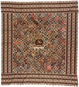 Etonnantes couleurs que je qualifierais volontiers d’exotiques ! Trouvé ainsi, ce quit me semblait bizarre… jusqu’à ce que je trouve une autre photo du quilt, certainement bien plus proche de la réalité (voir ici), extraite d’un livre numérisé (American Quilts, The Democratic Art, Robert Shaw). Quelle différence…