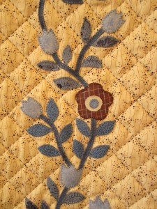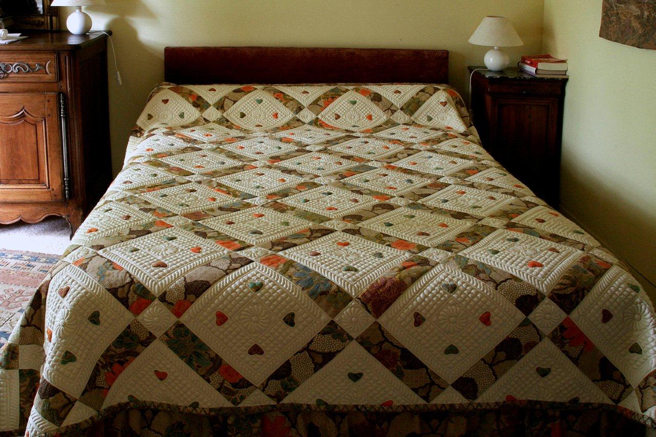A vous donc de trouver -ou de créer- une maquette dans l’esprit de la fin du XIXe siècle, de la dimensionner généreusement, de créer une gamme de couleurs si possible un peu innovante mais restant dans « l’esprit tradi »… Et il faut surtout avoir de la passion pour votre ouvrage car vous allez vivre des centaines d’heures avec lui ! Il vous faut aussi une bonne pratique du matelassage main, des tendons prêts à l’épreuve du quilting intensif… Je me souviendrai toujours de mon sentiment de culpabilité après avoir incité notre abeille Maïté à terminer le quilting de son Arbre de Vie pour une exposition mineure… ce qui s’est soldé par une inflammation durable des tendons du poignet. Attention à toutes, prévoyez une grande marge de temps pour le matelassage. C’est finalement sa qualité, sa densité qui conditionneront la sélection finale de votre ouvrage.