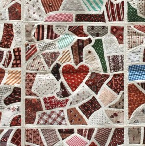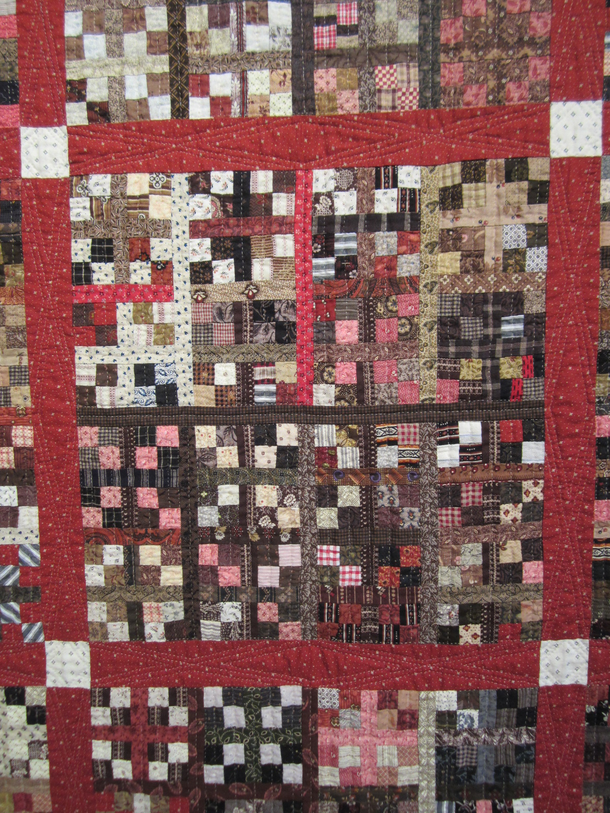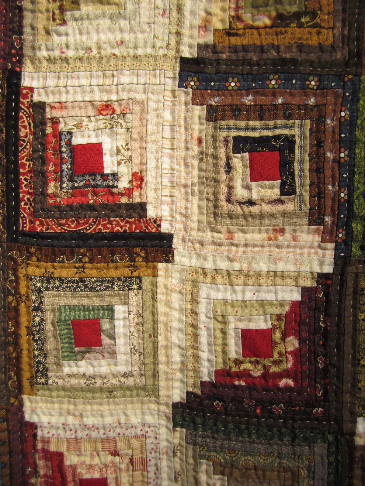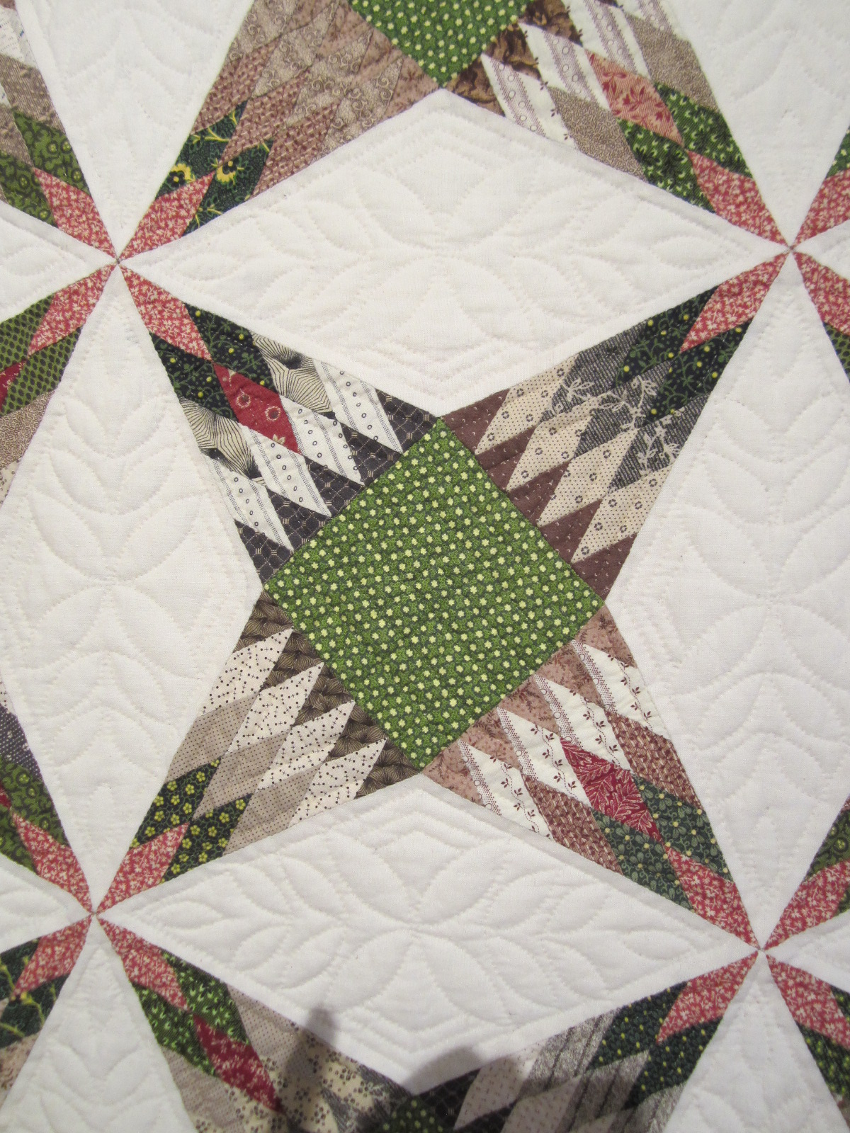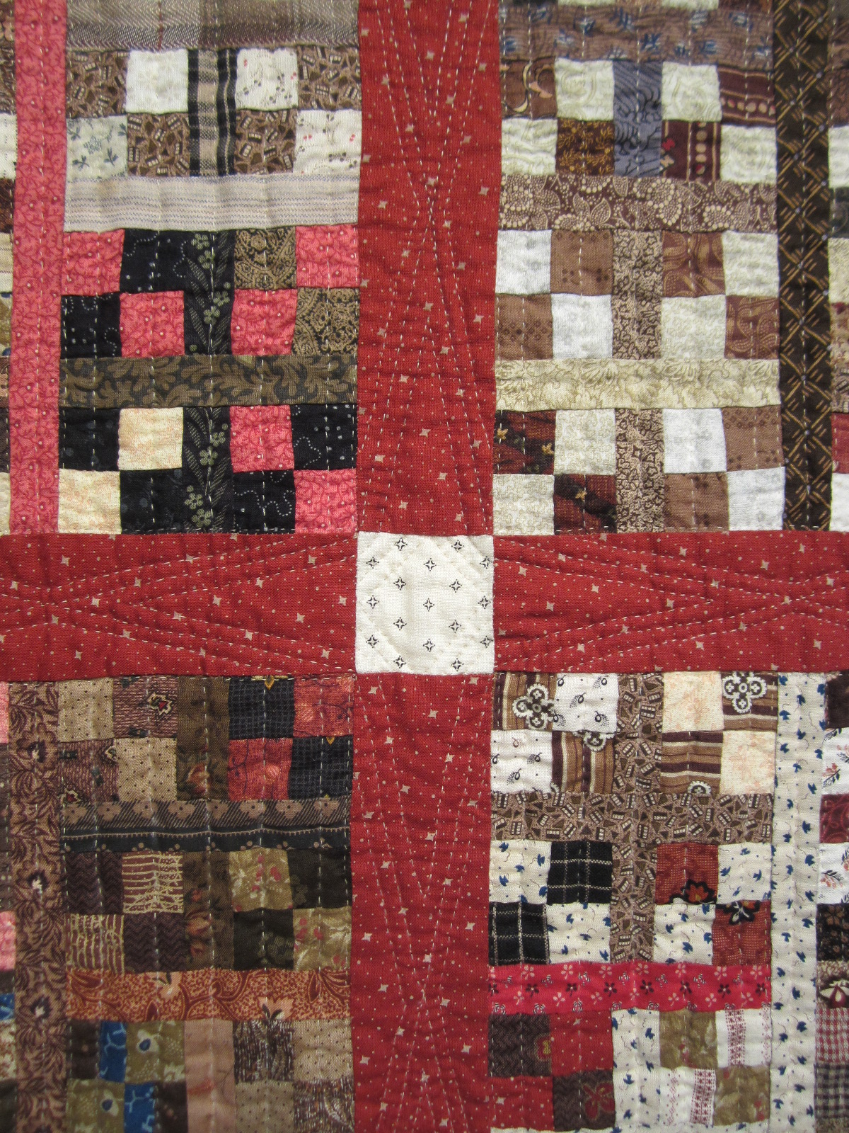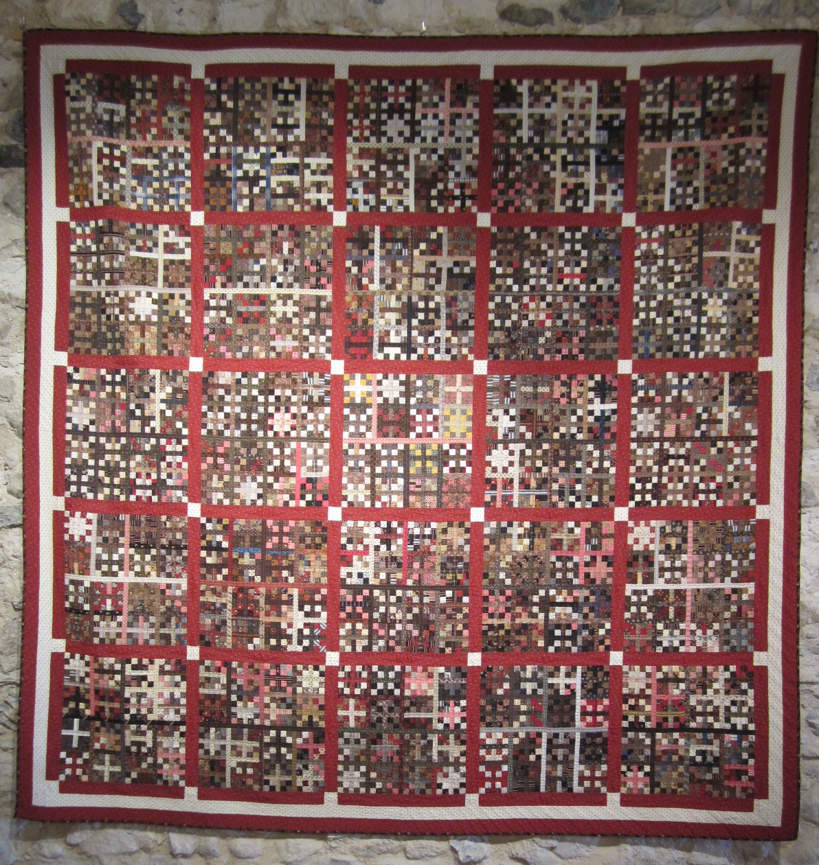 Reproduction d’un quilt des années 1880 déniché chez une antiquaire à Chicago par la quilteuse Mary Elizabeth Kinch qui fut époustouflée par ce bloc inconnu si scrappy ! Vous pouvez voir mes débuts très modestes, à peine étoffés depuis, par ici. Admirez le matelassage extrême de ce quilt en cliquant sur les photos. Quelle réussite !