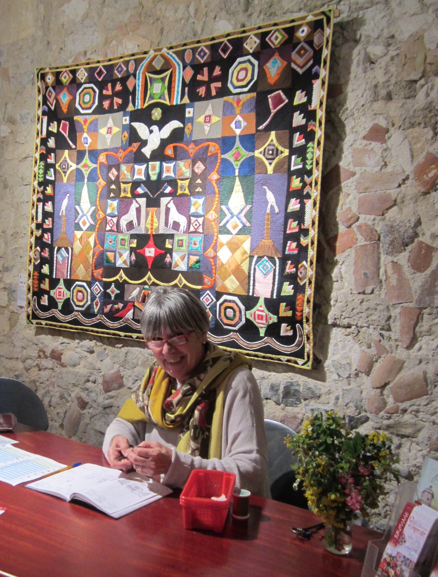 Aline à l’accueil, toute souriante, avec en arrière-plan un singulier quilt de mariage en soie, satin et taffetas de Jocelyne Picot (150 x 180 cm). L’original fut créé par un tailleur new-yorkais d’origine allemande pour le mariage de sa fille en 1901. L’effet soyeux et les coloris exubérants me font penser à une tenture indienne !