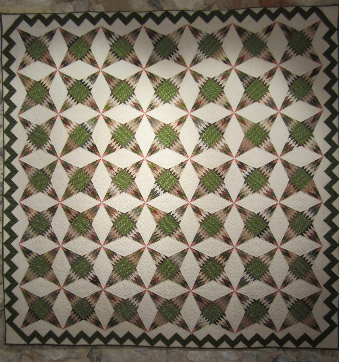 Shenandoah, nommé d’après un Comté en Virginie. Ce quilt, à la dominante vert poison et à la belle bordure en chevrons vert sapin, fascine ou déplaît : le vert est une couleur très ambivalente.