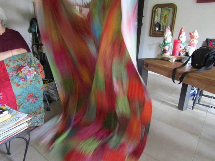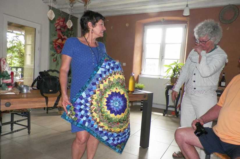 Nous avons commencé par les quilts de Joëlle. Installons-nous et admirons les ouvrages que déplie Christine avec jubilation !