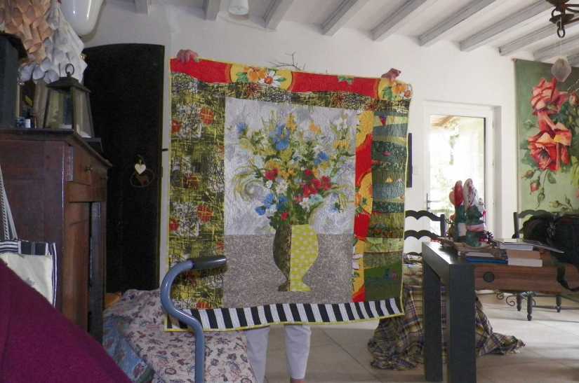 Le château date de la Renaissance et a été remarquablement rénové ; ses murs de lauze d’un gris chaud (le fameux taupe des tissus japonais peut-être) met les quilts parfaitement en valeur.