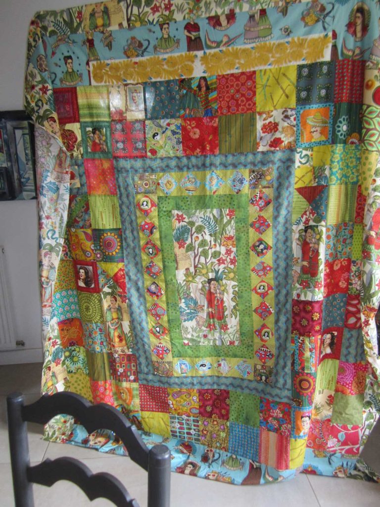 Mon séjour en France, en juin 2018, reste un de mes plus chers souvenirs. Depuis le jour où nous avons rendu visite à Christine Meynier à Penne dans le Tarn, j’ai en tête les magnifiques quilts qu’on a admirés au milieu des rires et de la pure joie d’être ensemble, Christine, Joëlle de Baillencourt, toi et moi. Le splendide top créé par Joëlle, dédié à Frida Kahlo, a particulièrement résonné dans mon cœur, t’en souviens-tu ?