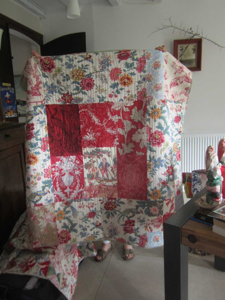 Katell, je te montre plein de photos du quilting en cours, tu verras ainsi la beauté des imprimés et l’assemblage en puzzle :