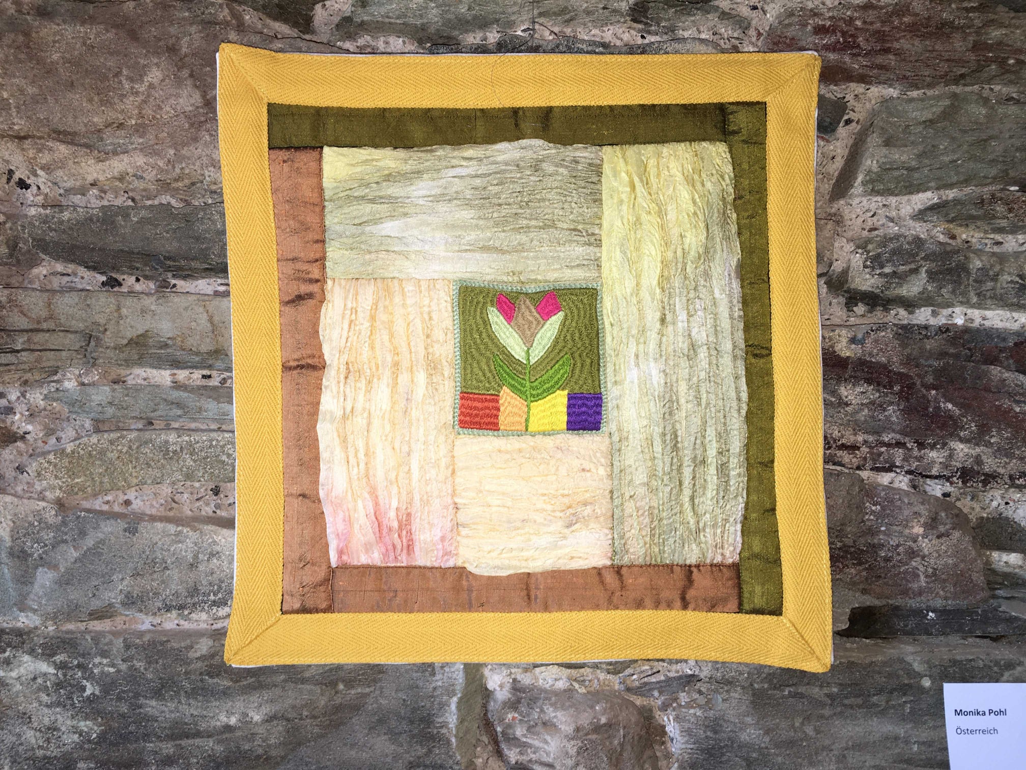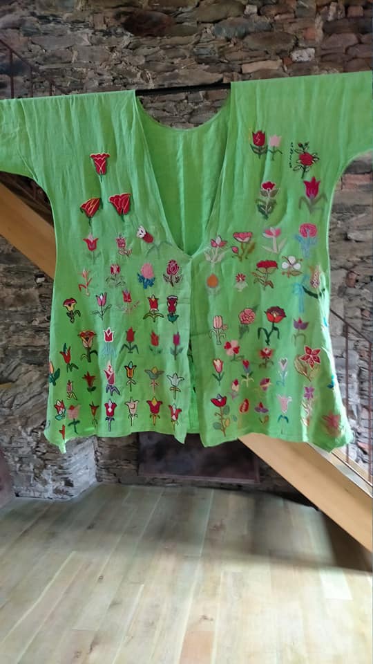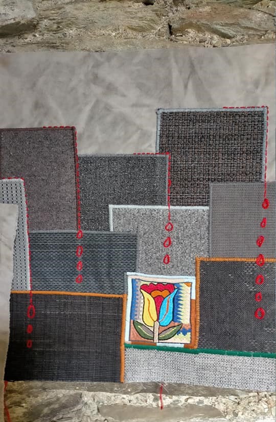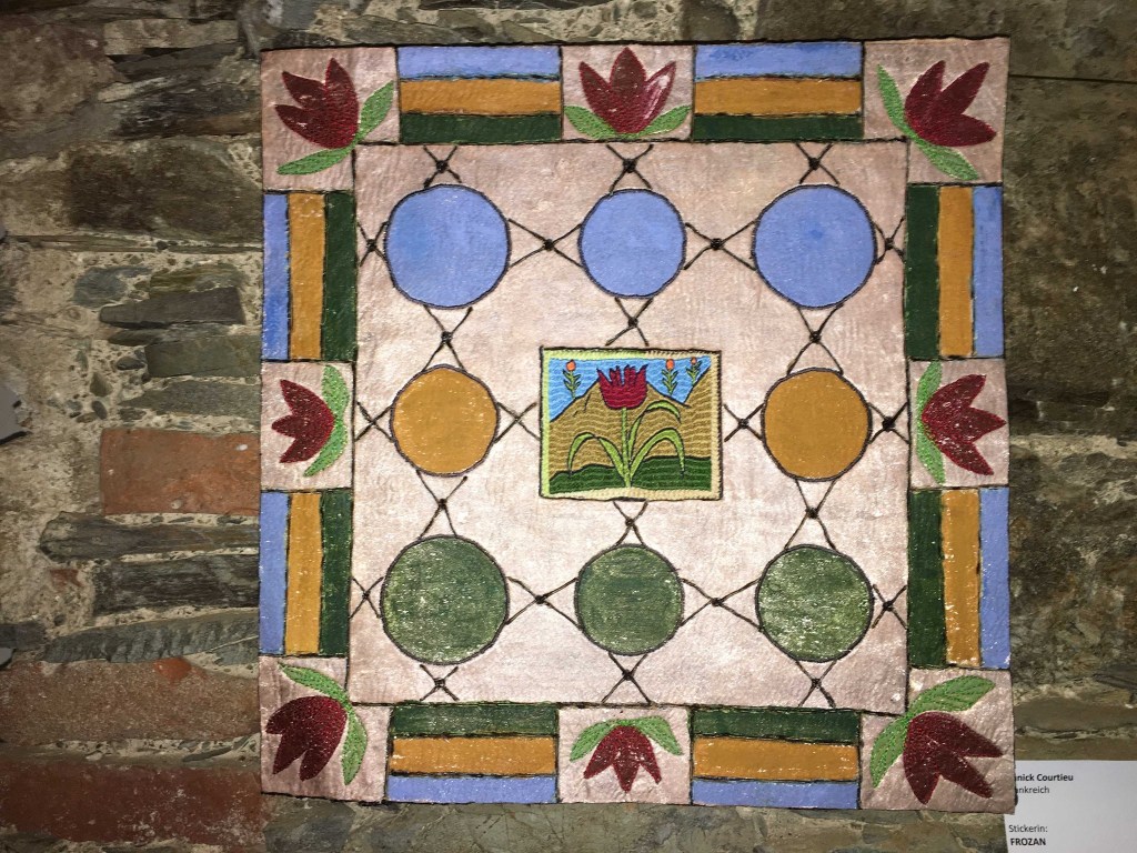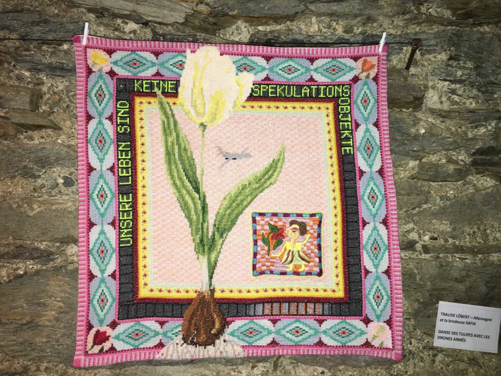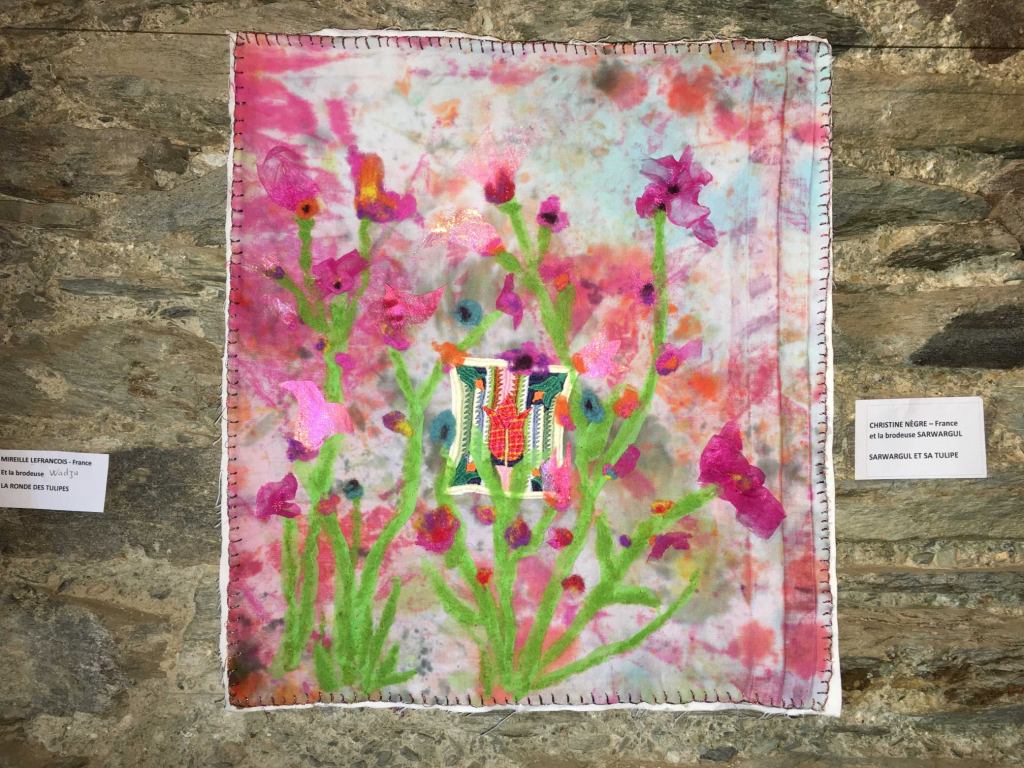 Il faut monter quelques marches pour arriver dans un autre monde. Oui, vous pouvez jeter un coup d’œil par la fenêtre, la vue est si belle ! Ensuite, nous découvrons l’union des broderies afghanes et mix-media, principalement des tissus mais pas seulement. Le thème est La Tulipe : c’est un festival de petits univers ! Bien sûr, les représentantes de l’association Guldusi, membres du club de patch la Courtepointe de Réalmont (81), vendront des broderies afghanes : des tulipes pour planter les bulbes de la joie et de la solidarité féminine par-delà les conflits.