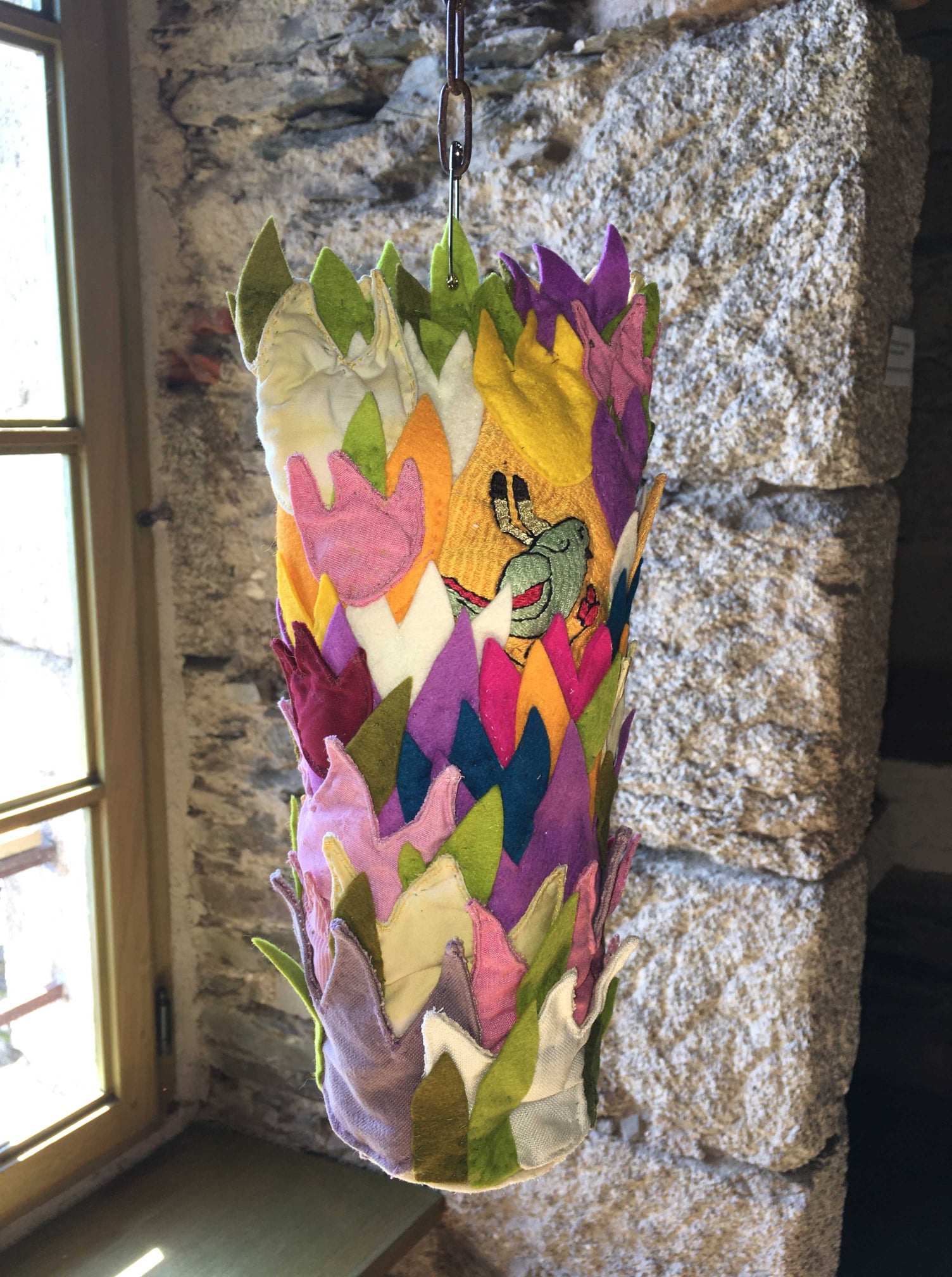 Il faut monter quelques marches pour arriver dans un autre monde. Oui, vous pouvez jeter un coup d’œil par la fenêtre, la vue est si belle ! Ensuite, nous découvrons l’union des broderies afghanes et mix-media, principalement des tissus mais pas seulement. Le thème est La Tulipe : c’est un festival de petits univers ! Bien sûr, les représentantes de l’association Guldusi, membres du club de patch la Courtepointe de Réalmont (81), vendront des broderies afghanes : des tulipes pour planter les bulbes de la joie et de la solidarité féminine par-delà les conflits.