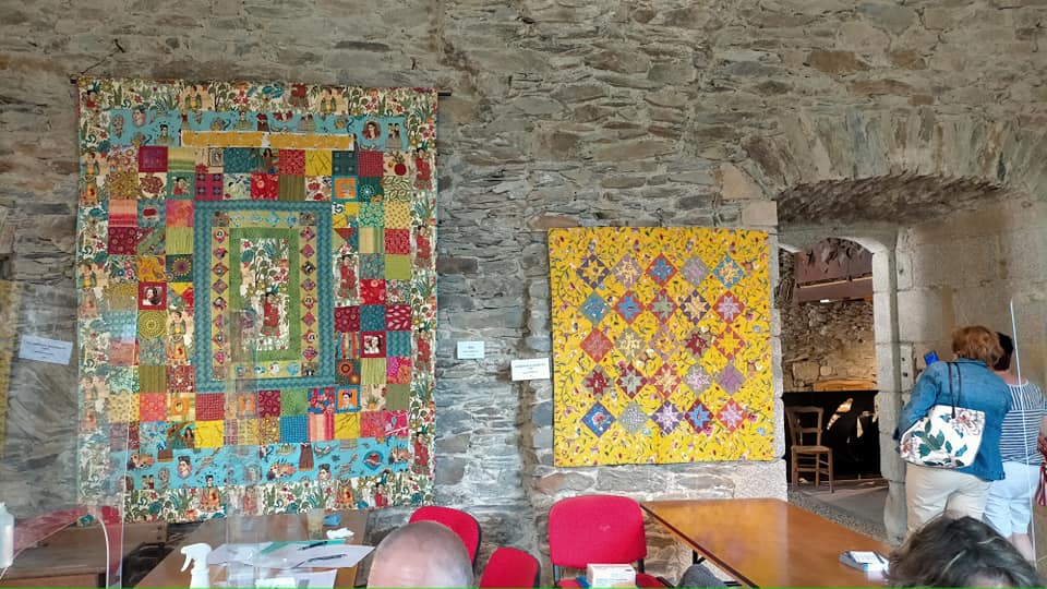 Si nos quilts sont notre petite fierté, que dire lorsqu’on entre dans le Château ? Nous étions bouche bée en admirant les chefs d’œuvre des Filles Du Rouvray ! Des quilts de Soisik Labbens, Cosabeth Parriaud, Marie-Christine Flocard, Viviane Martin, Joëlle de Bailliencourt, Inès Travers et Christine Meynier vont vous rappeler de bons souvenirs du Rouvray. Leurs quilts, souvent connus pour avoir été exposés, publiés au fil des 30 dernières années, ont trouvé un écrin à la hauteur : les pierres du château Renaissance mettent toutes les couleurs et textures en valeur. Cette exposition fut particulièrement difficile et douloureuse à organiser, avec deux décès récents dans le groupe. Malgré tout, et aussi en honneur à cette pépinière extraordinaire de talents que fut Le Rouvray à Paris, cette exposition a lieu. Bravo Christine Meynier, pour ta persévérance et tous tes efforts, enfin récompensés !
