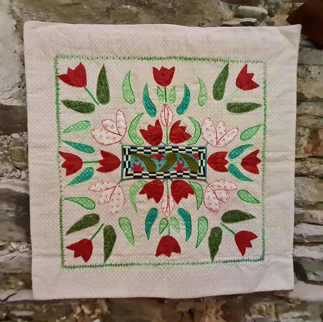 Montons encore quelques marches dans ce beau château et nous découvrons… des tulipes ! Les tulipes ont une longue histoire (voir ici) et leur forme les rendent parmi les favorites des quilteuses… mais aussi des brodeuses afghanes, pour une série splendide !