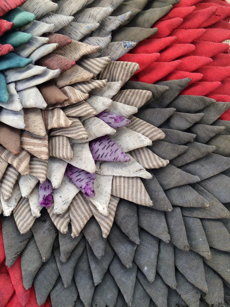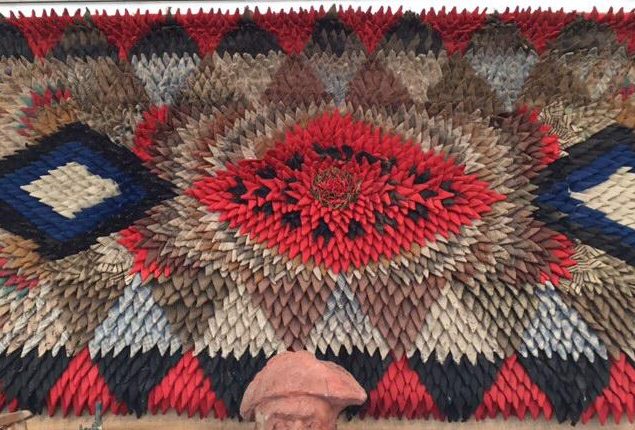 On peut le constater, il est ancien, certains tissus sont abîmés, mais qu’il est beau ! Les carrés pliés en 3 font des triangles plus pointus que la technique de Betty. Cela rappelle les tapis des Russes qui font souvent des rosaces extraordinaires avec cette technique. Est-il de France ? C’est vraisemblable, les tissus semblent très français et on voit, dans la collection de Michel Perrier (ses Mosaïques d’Étoffes seront exposées à Brouage du 22 au 28 avril 2019), nombre d’ouvrages faits de languettes, de carrés pliés, faits dans nos campagnes…
