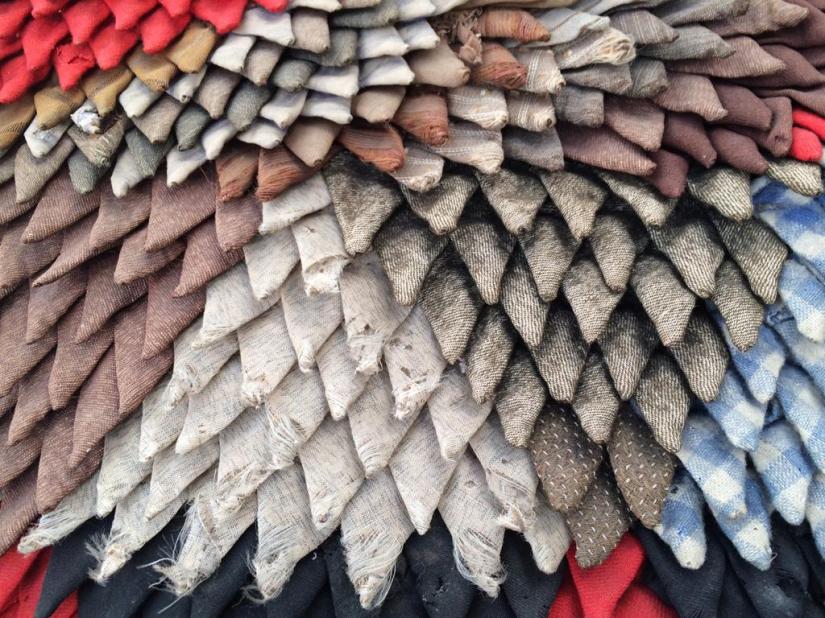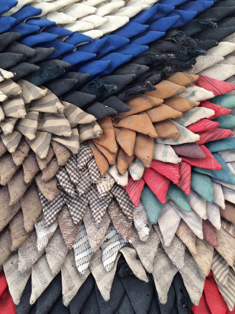 On peut le constater, il est ancien, certains tissus sont abîmés, mais qu’il est beau ! Les carrés pliés en 3 font des triangles plus pointus que la technique de Betty. Cela rappelle les tapis des Russes qui font souvent des rosaces extraordinaires avec cette technique. Est-il de France ? C’est vraisemblable, les tissus semblent très français et on voit, dans la collection de Michel Perrier (ses Mosaïques d’Étoffes seront exposées à Brouage du 22 au 28 avril 2019), nombre d’ouvrages faits de languettes, de carrés pliés, faits dans nos campagnes…