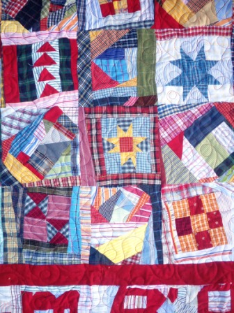 Hier Jo a lancé la première étape avec des blocs aux vols d’oie… bien sûr tout biscornus, coupés et cousus sans souci d’exactitude. Ses tissus sont du pur recyclage de chemises et autres vêtements à rayures et à carreaux, avec un tissu rouge unissant le tout. Moi, je reste dans mon ambiance amazonienne et les tissus restant d’anciens ouvrages :