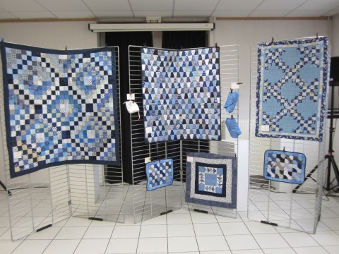 Vous voyez ici au centre le quilt de dés bleus cousu par Evelyne, un des superbes lots de tombola de la dernière expo de Colomiers.