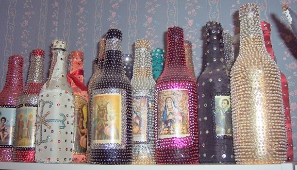 J’ai commencé à collectionner les drapeaux et bouteilles vaudou à la fin des années 1970, lors d’un séjour dans les Îles Vierges, à Saint-Thomas. Jamais je n’avais vu d’objets aussi fascinants au cours de mes voyages précédents ! J’adore tout ce qui brille, les paillettes et les strass, et c’était le summum du brillant dans le monde des arts ! Autant que je le sache, cette forme d’art est unique, à Haïti. Attention à ne pas tenter de les copier, Haïti a établi un copyright mondial sur cet art.