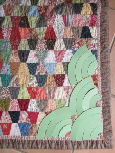 A cette époque donc, les femmes quiltaient sur un cadre fixe, souvent à plusieurs, lors des « quilting bees » (réunions d’abeilles quilteuses) et je crois que cela bourdonnait comme dans une ruche ! Ce dessin en quarts de cercles peut se commencer à plusieurs endroits à la fois, il est facilement ajustable et le quilting en ligne arrondie, qui suit le mouvement du bras, est particulièrement agréable.