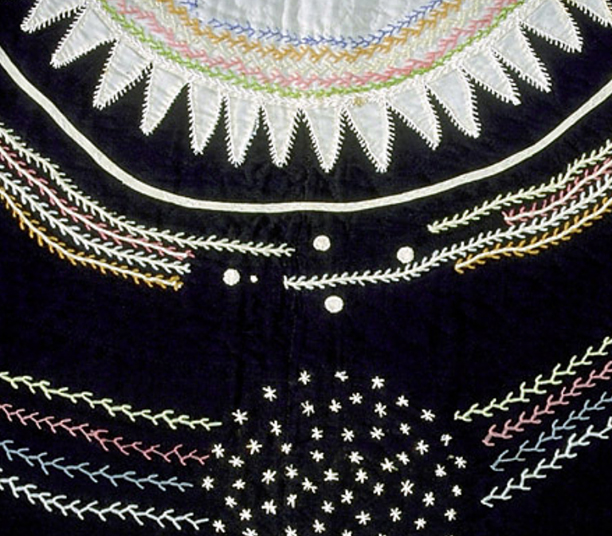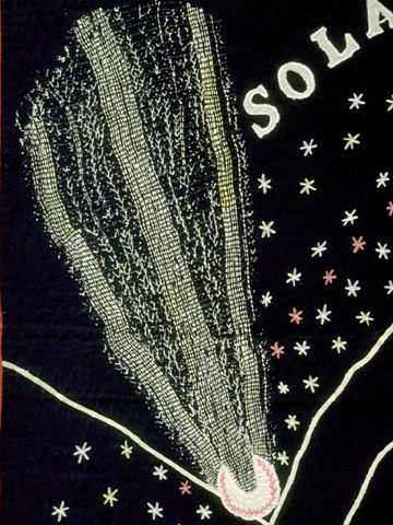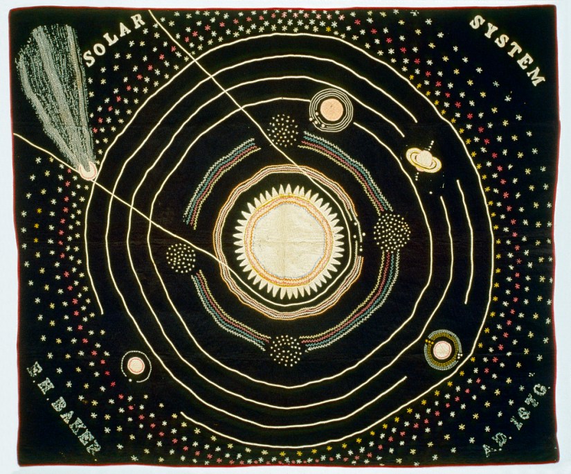 Le top est fait sur une étoffe de laine noire, doublé d’un tissu laine et coton, brodé et appliqué de laine et de soie. Il fut terminé au bout de 7 ans. Il est dans l’esprit des gravures scientifiques d’alors et son système solaire est exact. Elle passa de longues heures au télescope de Chicago pour bien capter les lunes de Jupiter, les anneaux de Saturne… Bien sûr Pluton n’y est pas, planète découverte en 1930.
