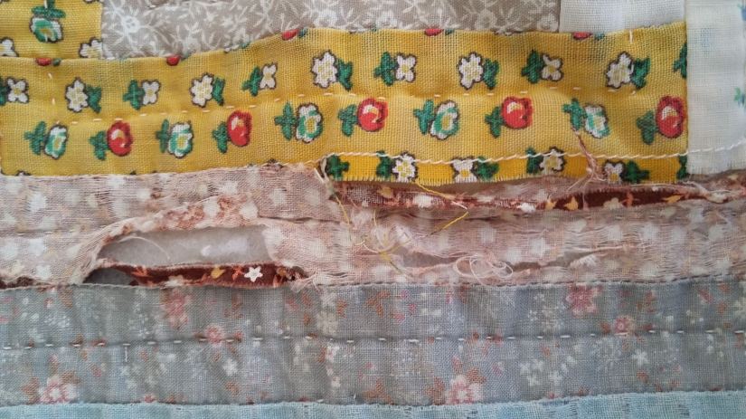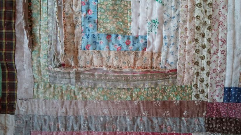 Ce quilt n’est probablement pas très ancien, c’est un Log Cabin fait à la machine dans les années 1960 peut-être. Le 1/4 d’inch est quasiment respecté mais, autre problème, le fil blanc a cisaillé le tissu de coton… Probablement un fil en polyester, trop solide pour les cretonnes et les divers tissus en coton utilisés… A garder en mémoire !!