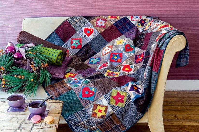 Là encore, on ne parle pas de marge de couture, on coud dans tous les sens, on pratique un mélange de piécé et d’appliqué, on ajoute des broderies qui tiennent le tout, la discrète n’a pas la parole alors qu’elle est omniprésente, cela va de soi. Mais en évoquant la folie du crazy, on peut se rapprocher des vraies origines multicentenaires du patchwork, l’assemblage en puzzle de tout ce qu’on avait comme textiles, quelle que soit la forme de la pièce, ou bien la réparation des vêtements ou linges de maison avec l’ajout d’une pièce pour cacher un trou… Il y aura une marge de couture minime… Économie oblige !