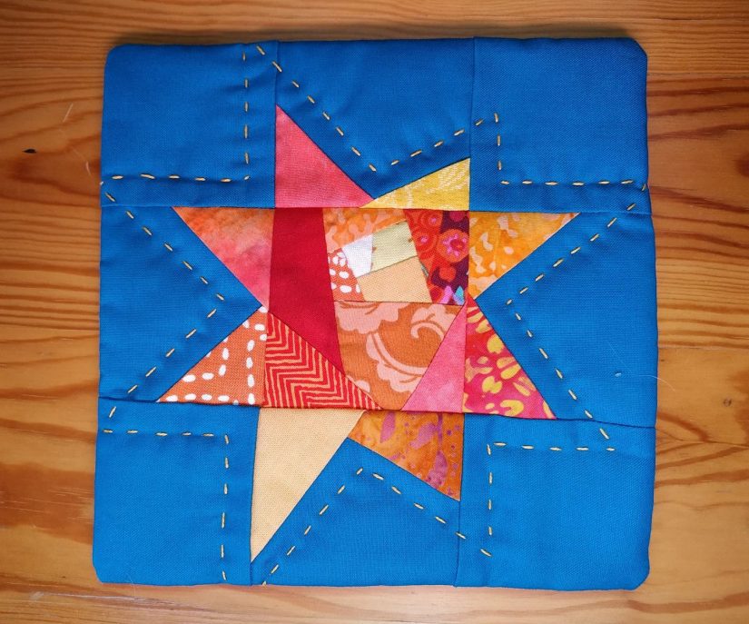 C’est tellement simple à faire que Maïté projette d’occuper ses petites-filles aux prochaines vacances en faisant des étoiles ⭐⭐⭐. Cette même technique peut s’utiliser en intersection de bandes intermédiaires d’un quilt où les blocs sont montés traditionnellement :