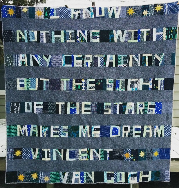 Nos quilts sont décoratifs, ils sont aussi expressifs avec parfois une citation, une pensée, un prénom, un mot fétiche… Pour cela, bien des techniques sont à notre disposition : broderie, appliqué main ou machine, couture sur papier, piécé (couture patchwork) pour les techniques 100% textiles, ou aussi transfert avec imprimante… De récentes expositions américaines, des publications sur Instagram et sur des blogs montrent de plus en plus de quilts qui parlent, utilisant toutes les techniques. C’est une tradition revisitée, car nombre de quilts anciens comportent des lettres, des signatures, des souhaits, des dédicaces… Voici un florilège de versions contemporaines :