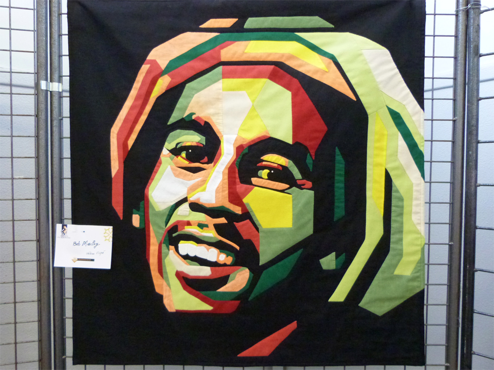 On voit bien ici l’alternance de wax (batiks africains) et d’autres tissus. Ce quilt n’est pas dans BeeBook, merci à Hélène Vispé de me permettre de le publier ici ! Les techniques sont semi-traditionnelles : les continents sont d’abord dessinés sur un non-tissé, les tranches cousues à la machine, l’ensemble appliqué à la main. Le quilting est également fait à la main.